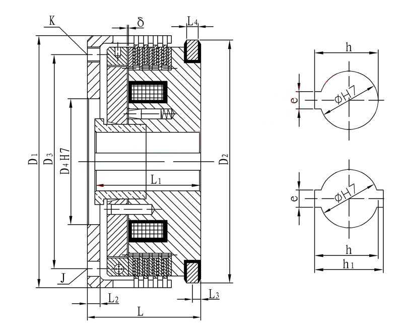 該系列離合器屬于磁通不經(jīng)過摩擦片組的結(jié)構(gòu)形式,短電后的殘余力矩小,動(dòng)作時(shí)間快。特別適用于對(duì)動(dòng)作時(shí)間有要求的場合使用。在使用過程中摩擦片磨損到一定程度,出現(xiàn)力矩下降時(shí),需將工作氣隙進(jìn)行調(diào)整。